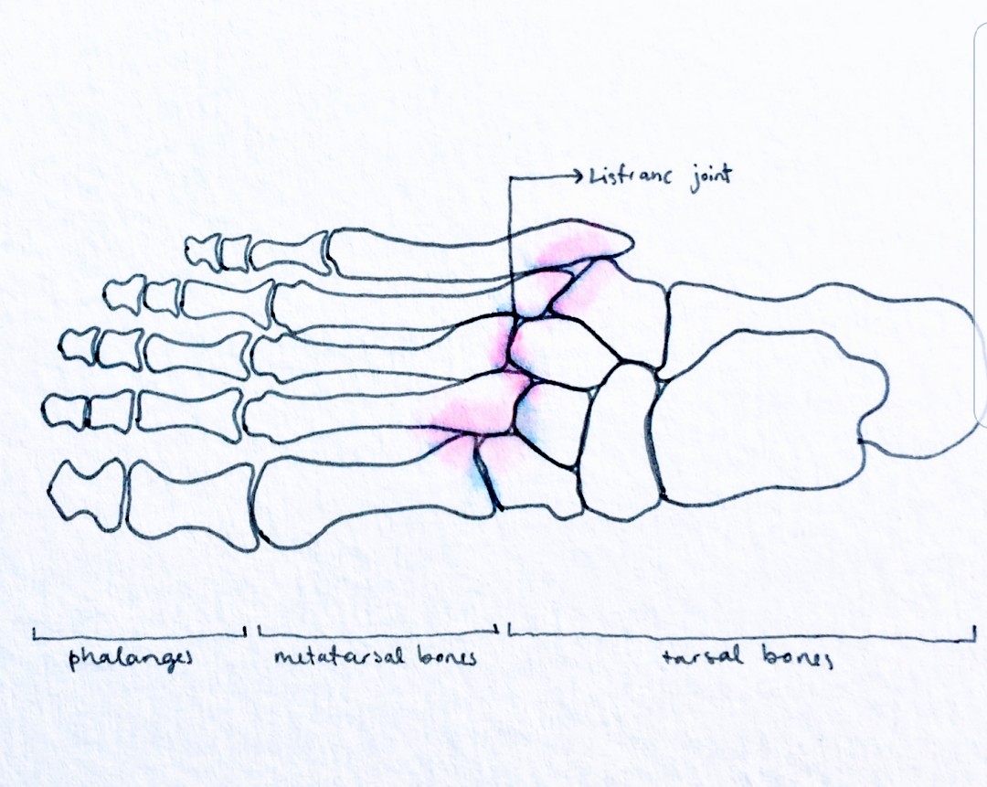 The foot arch is composed of the 3 cuneiform bones, the metatarsal bones and the cuboid. The keystone of this arrangement being the base of the second metatarsal bone. The extent of injuries is highly variable and ranges from ligamentous injury to unstable fracture-dislocations.