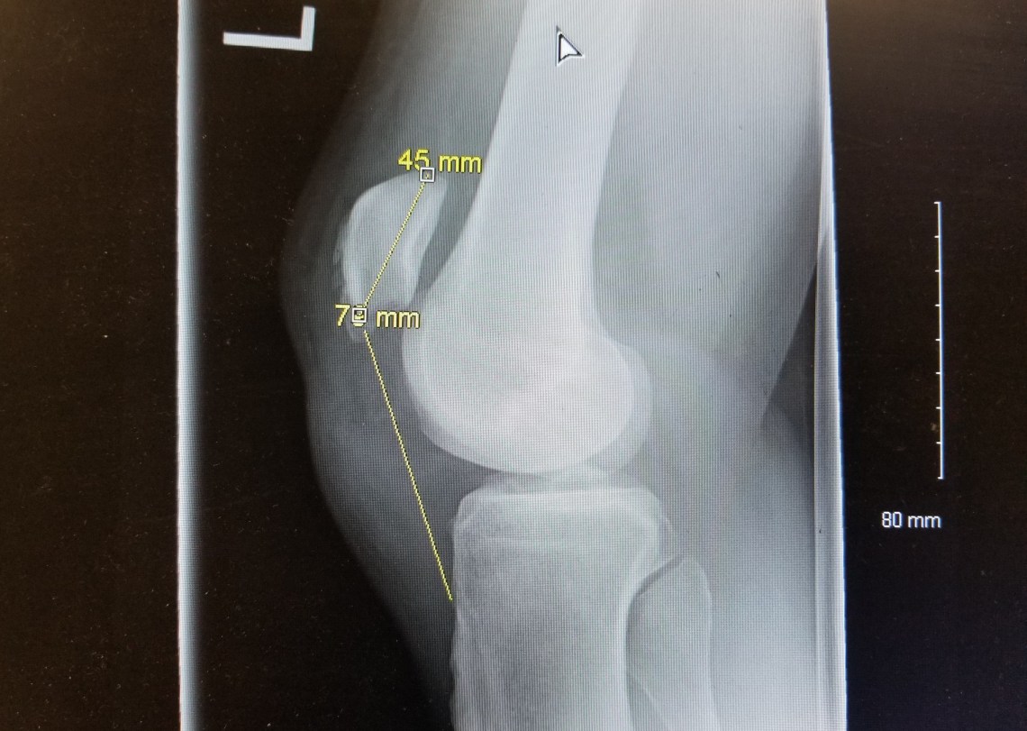 The patient had an inability to straight leg raise, a palpable infrapatellar sulcus and a high riding patella on his radiograph. He was diagnosed with complete patellar tendon tear and orthopaedics were consulted in house for operative repair.