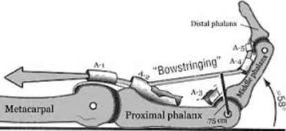 The physical exam helps determine the severity of the injury. Evaluate the injured finger through full range of motion.Intermittent inability to extend the finger indicates a dorsal migration of extensor tendon. Bowstringing should be specifically searched as it indicates full pulley rupture. Careful palpation of all « A« pulleys should be done to identify multiple pulley ruptures which will present as local pain at the level of the injured pulleys.