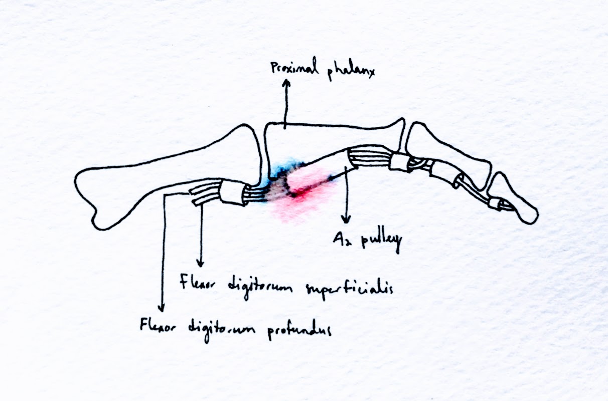 Also known as ‘’climber’s finger ‘’, A2 pulley injury is the most frequent injury, representing 30% of all injuries associated to climbing. It can range from a simple strain to a complete pulley rupture. The pulleys are tendon arrangements that hold the digital flexor tendon to the periosteum. A2 and A4 pulleys are the most important to accomplish the strong and precise flexion movements required in climbing. Anatomically, the A2 pulley is located at the mid portion of the proximal phalange. On the left 4th digit, the A2 pulley sits where your wedding ring would sit. A1 pulley is most commonly involved in trigger finger. The other pulleys are less clinically significant.